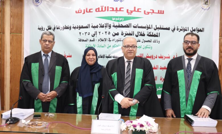 شهدت كلية الإعلام بجامعة القاهرة اليوم، مناقشة رسالة الدكتوراه المقدمة من الباحثة سجى علي عبدالله عارف، والتي تحمل عنوان: “العوامل المؤثرة في مستقبل المؤسسات الصحفية والإعلامية السعودية وتطورها في ظل رؤية المملكة 2025 إلى 2035”.