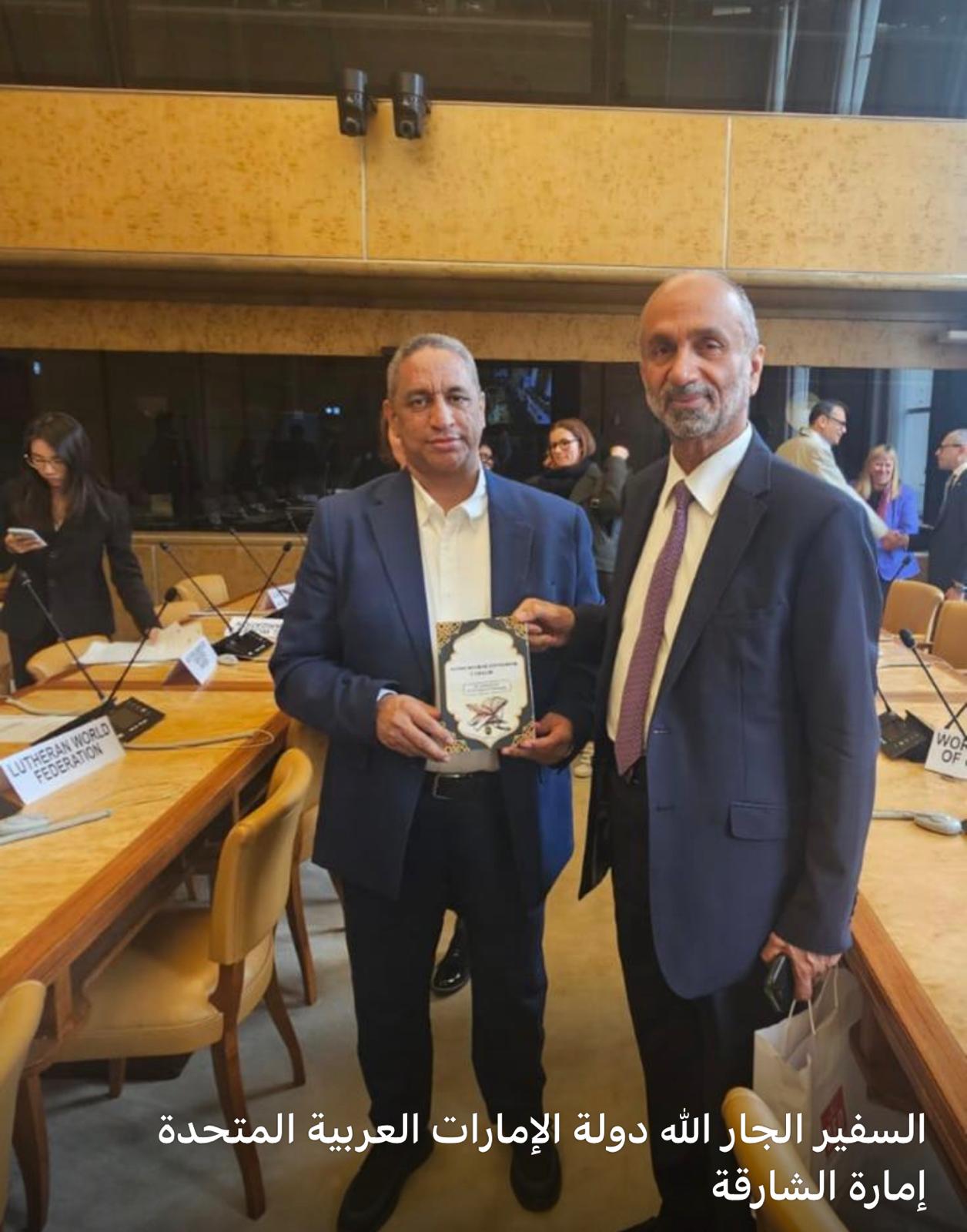 وقد تسلم نسخ الكتاب كل من الدكتورة عائشة الشريف ممثلة منظمة التعاون الإسلامي والسفير ديفيد فرنسيس مدير جامعة الأمم المتحدة للسلام في جنيف والسفير الجار الله ممثل دولة الإمارات العربية المتحدة والسيدة صافيك بافيا مسؤولة اللاجئين في الأمم المتحدة حيث أعربوا جميعا عن تقديرهم للمضامين الإنسانية والفكرية التي يحملها الكتاب ودوره في تعزيز قيم الحوار والتعايش والسلام