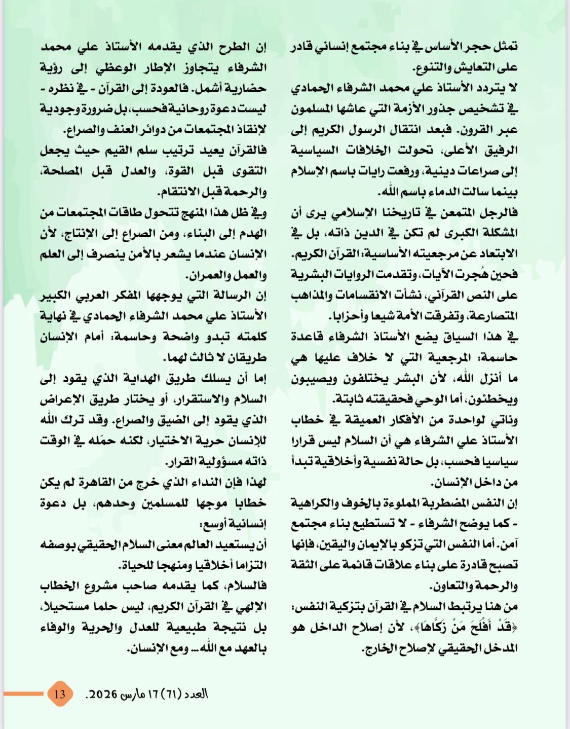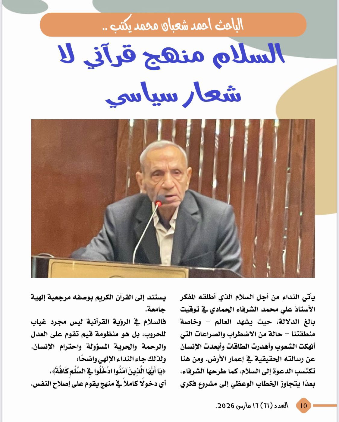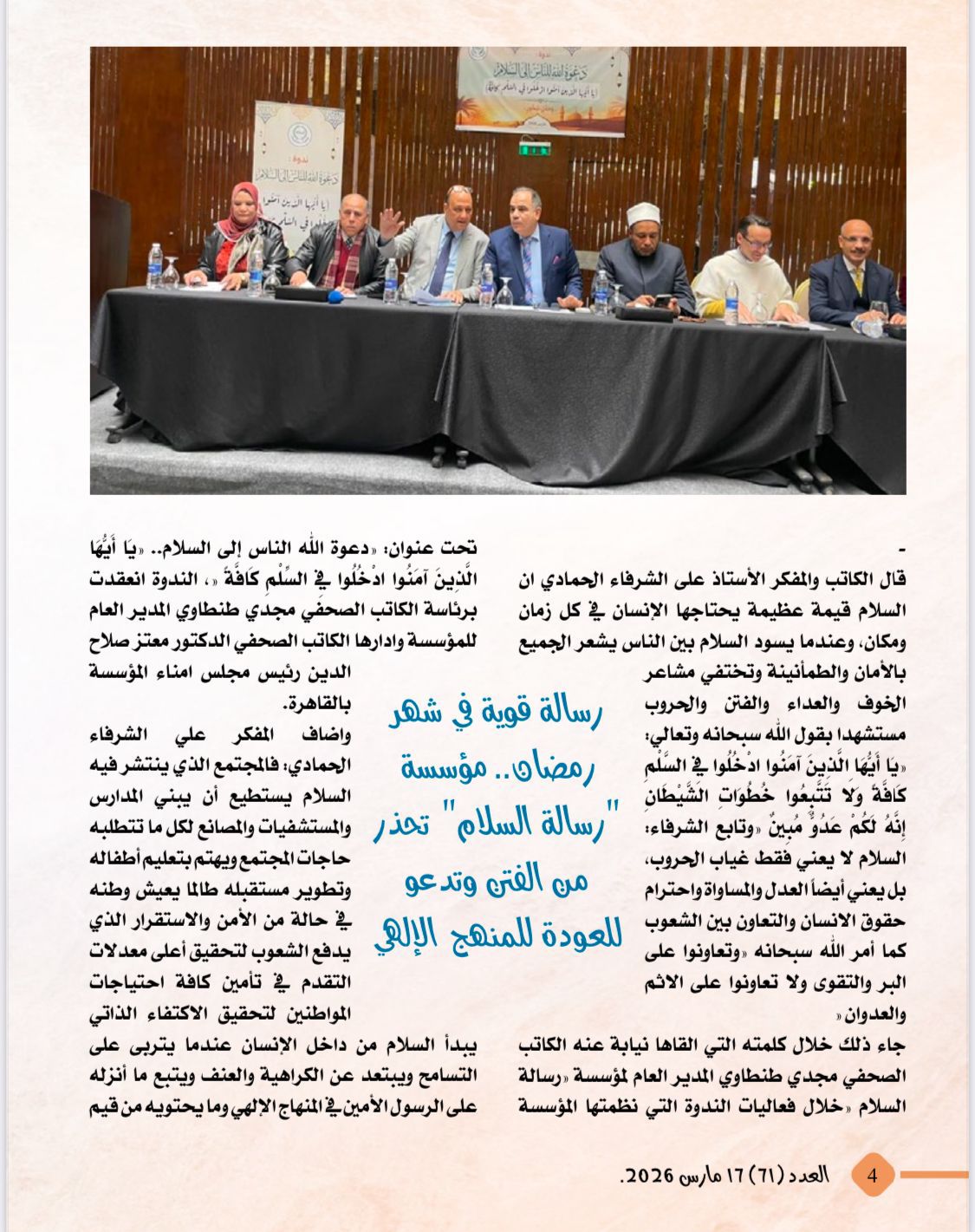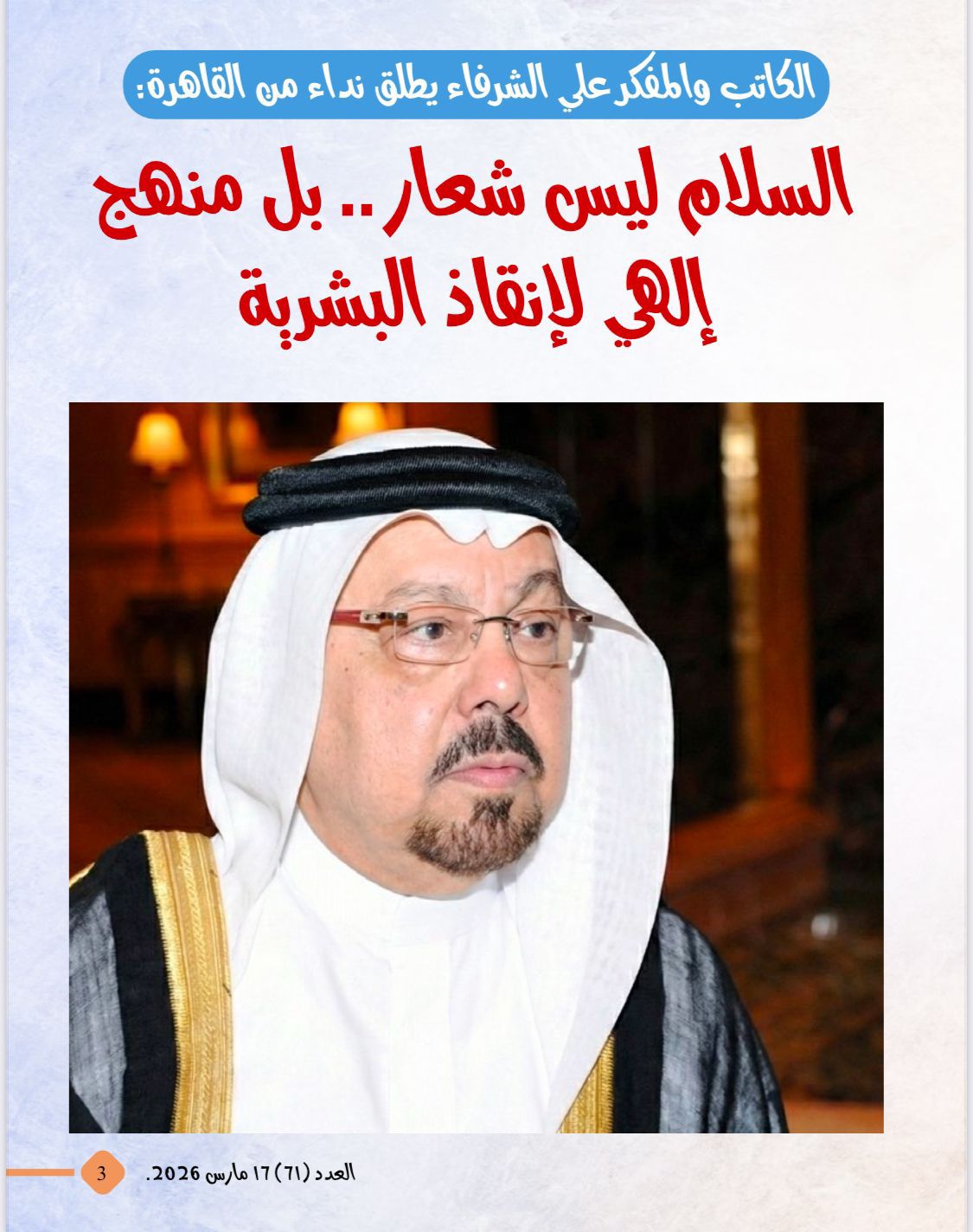 تصدر العدد تقرير عن نداء السلام الذى أطلقه الكاتب والمفكر الاستاذ على محمد الشرفاء الحمادى من ندوة مؤسسة رسالة السلام بالقاهرة وتضمن التقرير العناوين التالية
