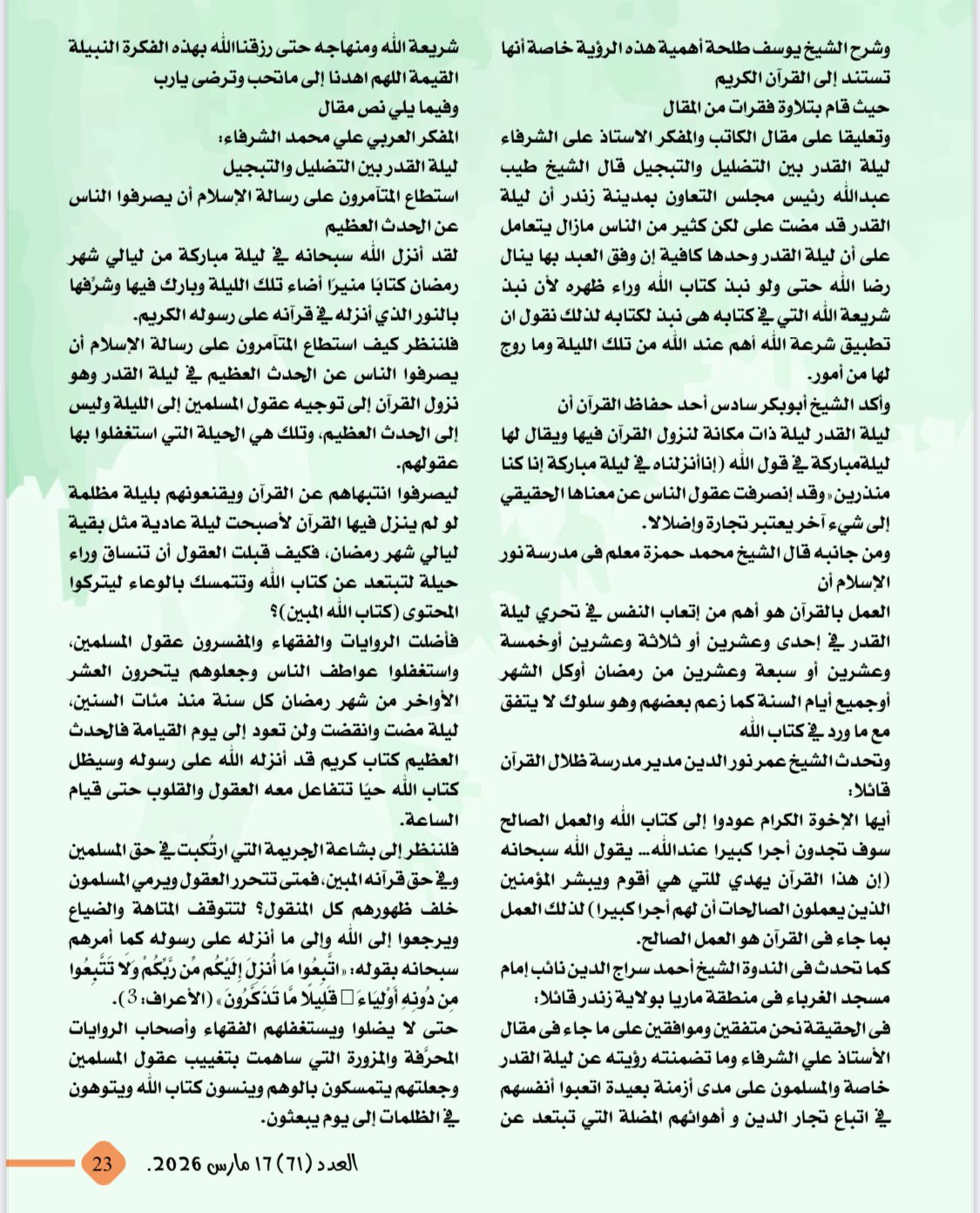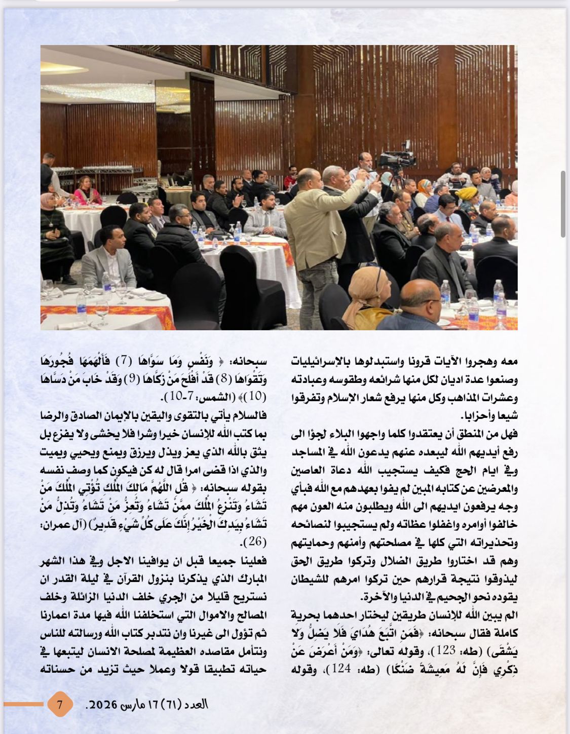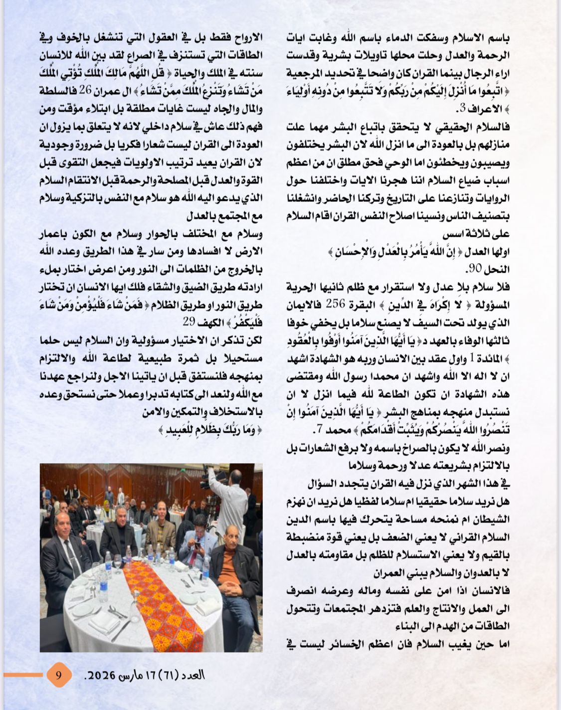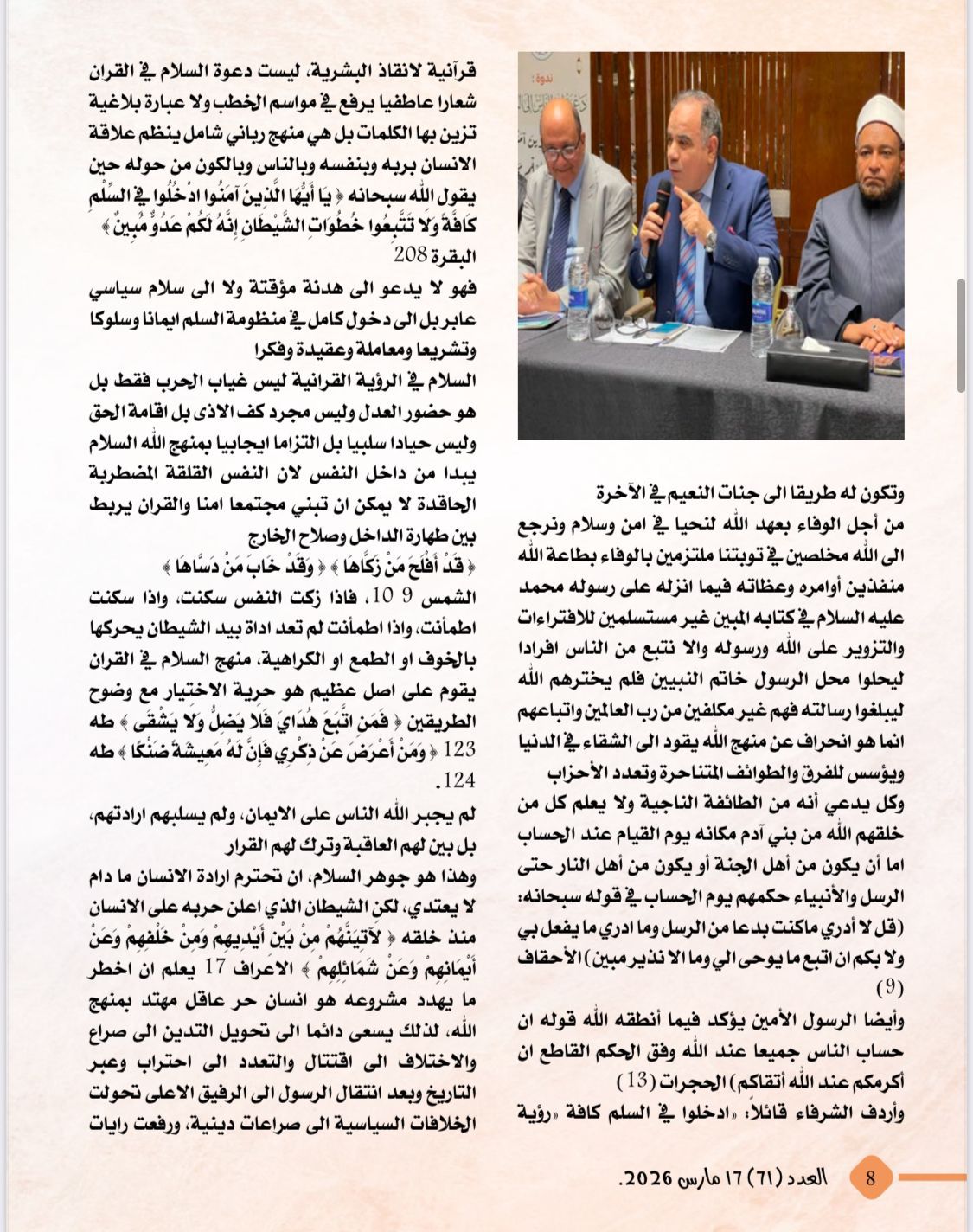 تصدر العدد تقرير عن نداء السلام الذى أطلقه الكاتب والمفكر الاستاذ على محمد الشرفاء الحمادى من ندوة مؤسسة رسالة السلام بالقاهرة وتضمن التقرير العناوين التالية