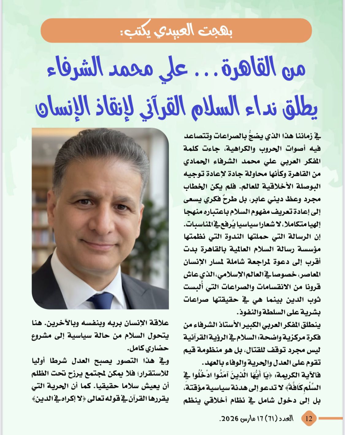 -بهجت العبيدي يكتب :من القاهرة على الشرفاء يطلق نداء السلام القرآنى لإنقاذ الإنسان