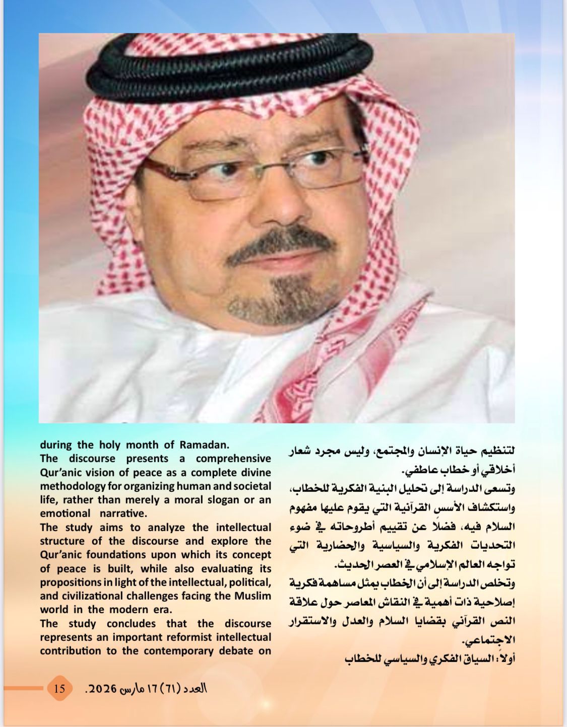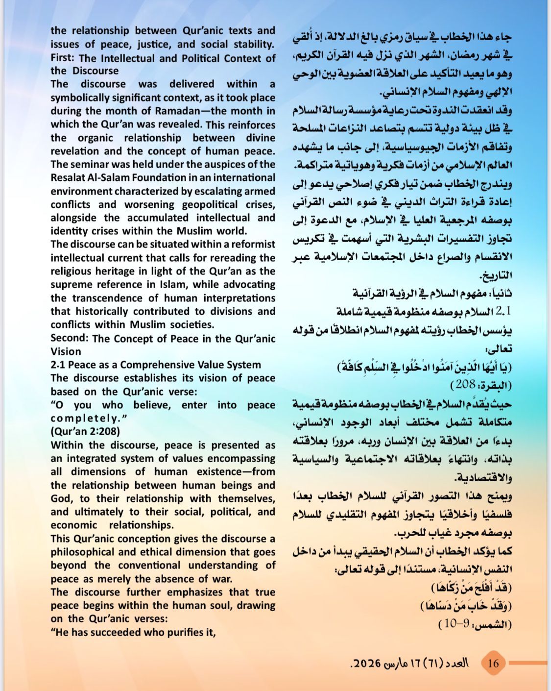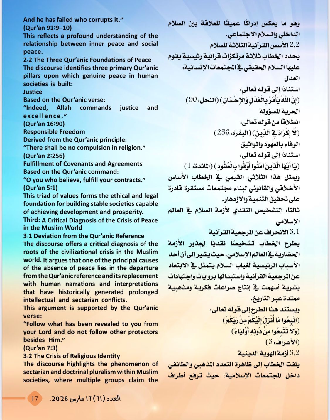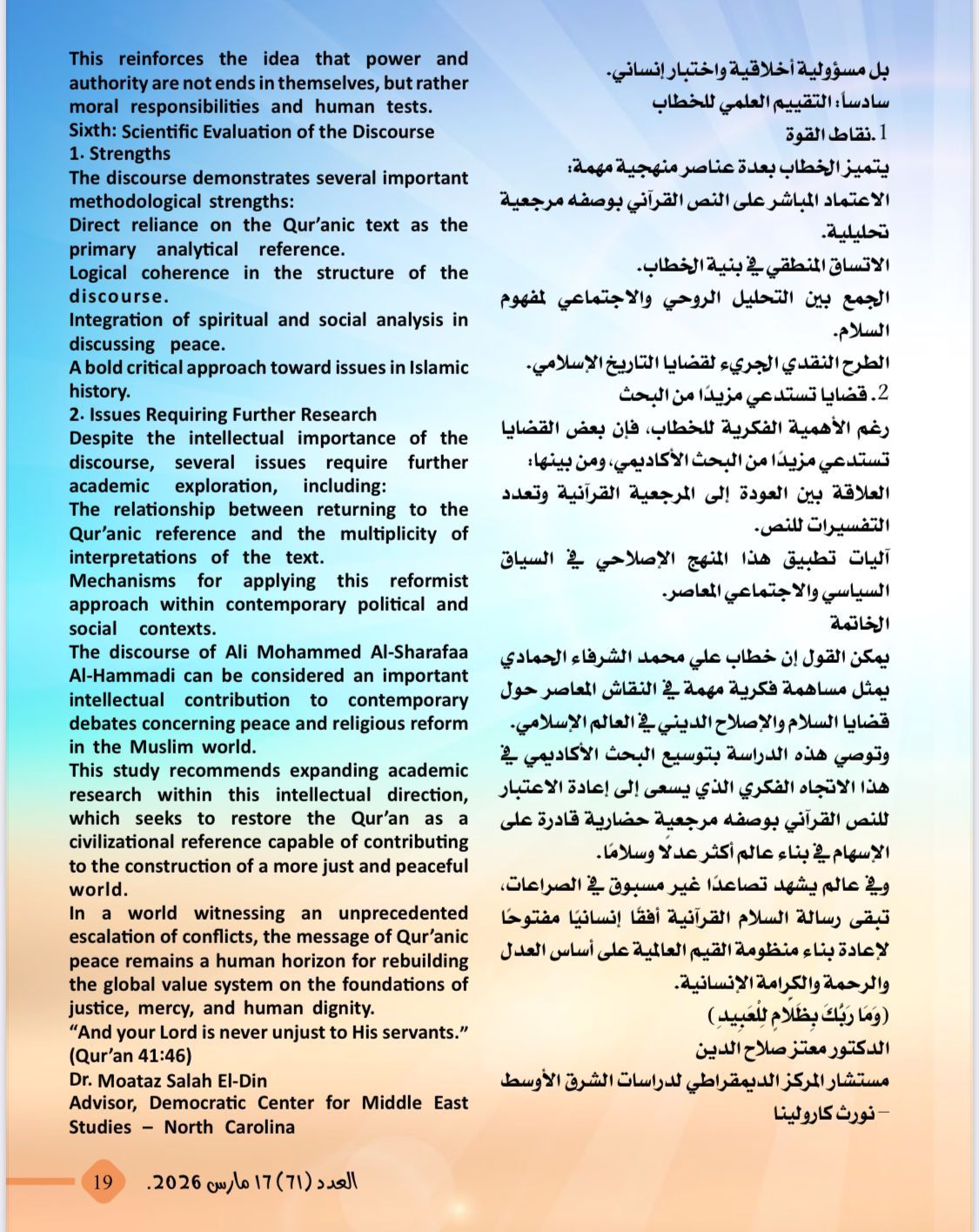 -دراسة تحليلية باللغتين العربية والإنجليزية تحت عنوان:السلام فى القرآن الكريم:من الشعار إلى المنهج الإلهي لإنقاذ البشرية