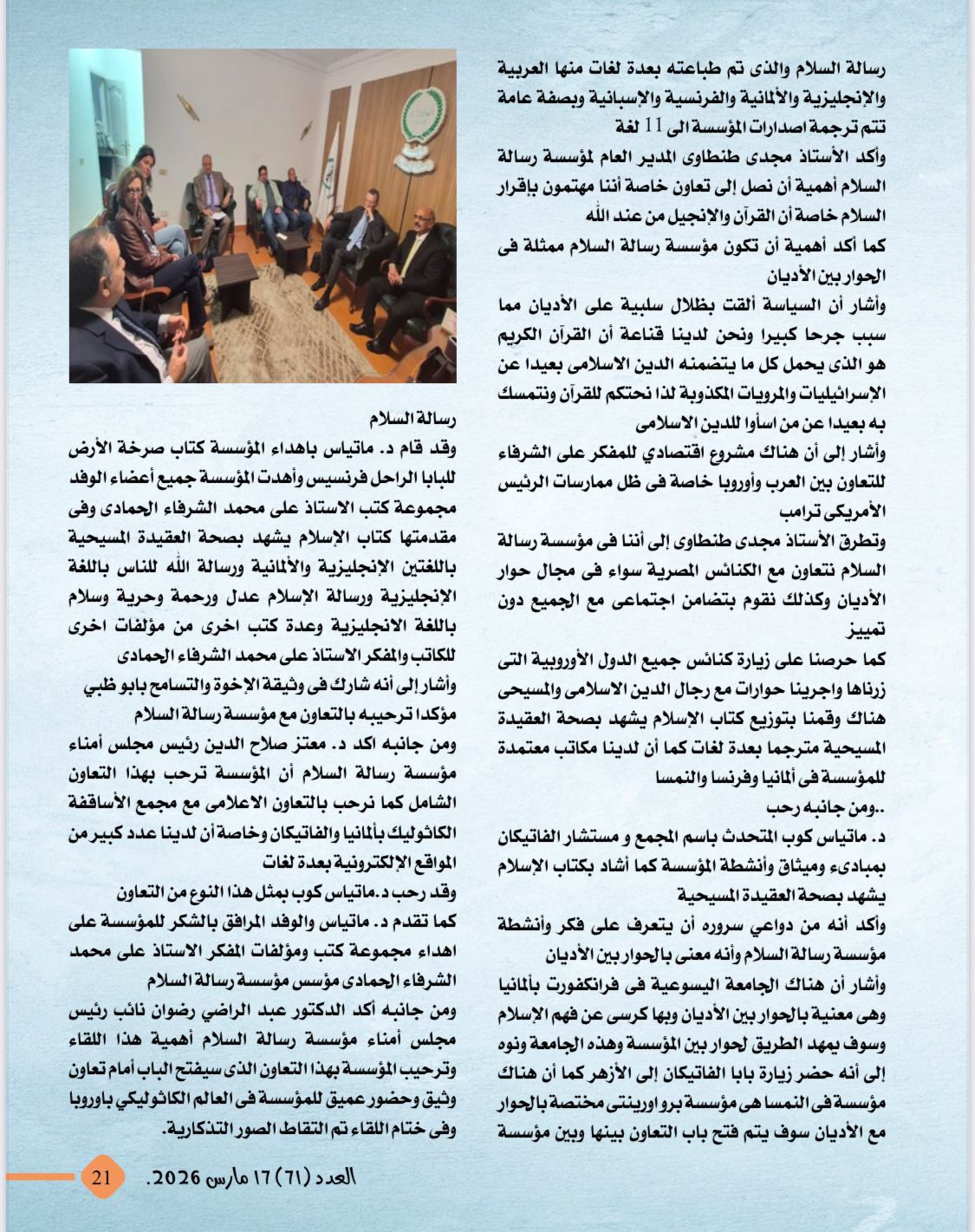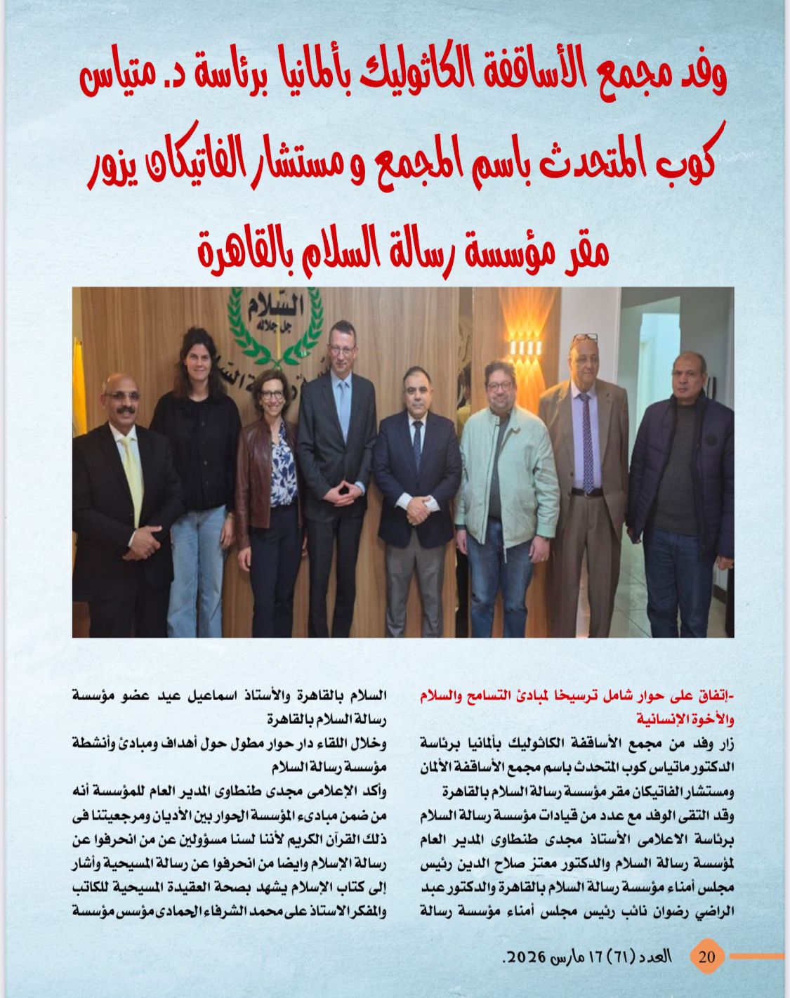 -وفد مجمع الأساقفة الكاثوليك بألمانيا برئاسة د.متياس كوب المتحدث باسم المجمع ومستشار الفاتيكان يزور مقر مؤسسة رسالة السلام بالقاهرة
