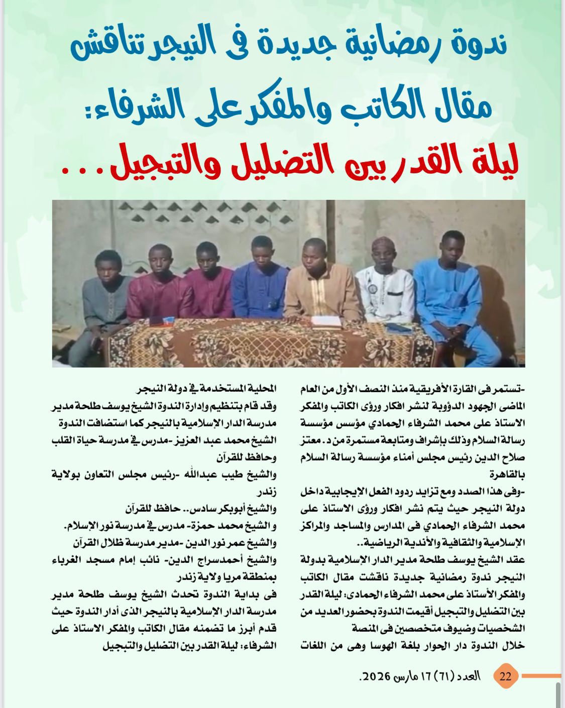 -ندوة رمضانية جديدة فى النيجر تناقش مقال الكاتب والمفكر على الشرفاء:ليلة القدر بين التضليل والتبجيل
