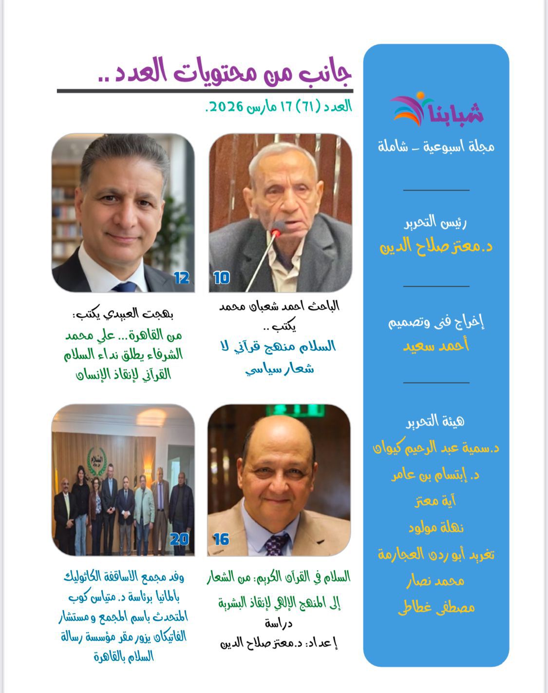 -يرأس تحرير مجلة شبابنا الكاتب الصحفي د. معتز صلاح الدين رئيس مجلس أمناء مؤسسة رسالة السلام بالقاهرة