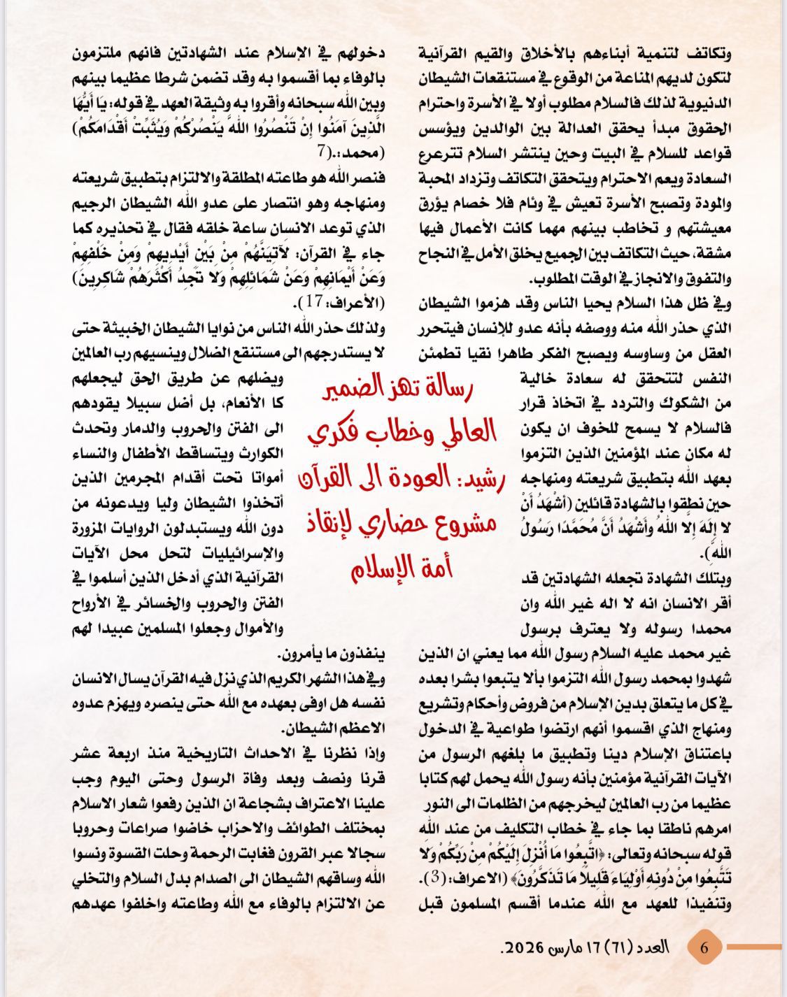-رسالة تهز الضمير العالمى وخطاب فكرى رشيد :,العودة إلى القرآن مشروع حضارى لإنقاذ أمة الإسلام