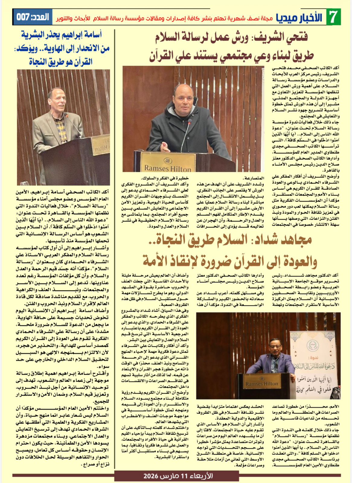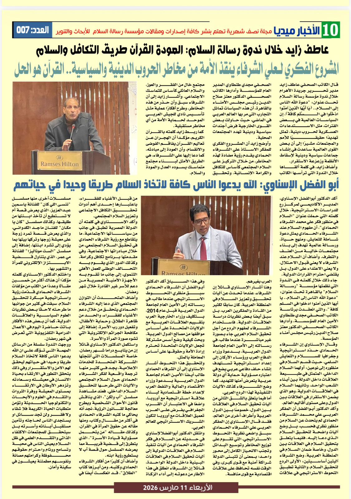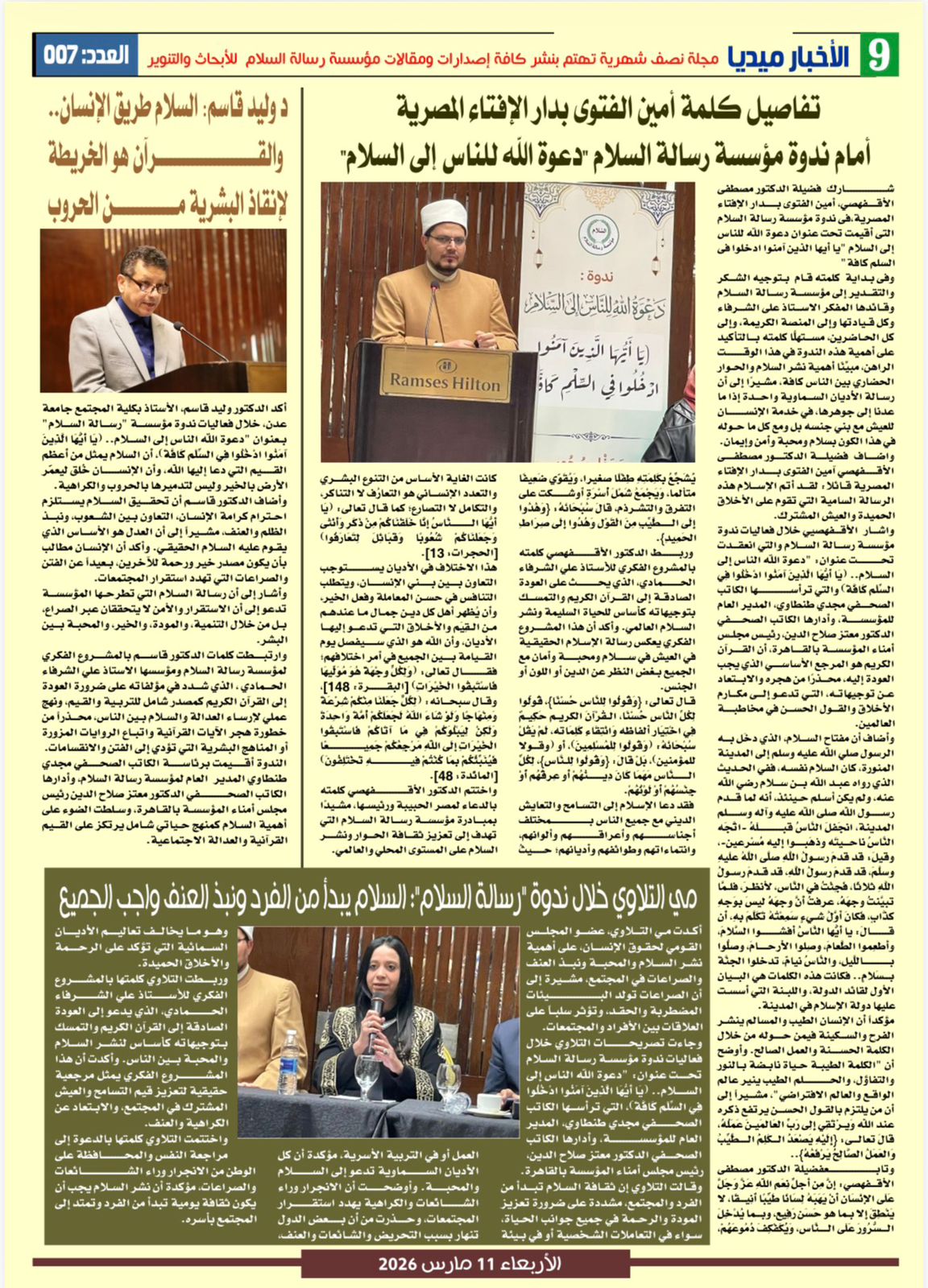 وتضمن العدد العديد من الأخبار والمقالات والتقارير الخاصة بأنشطة وفعاليات مؤسسة رسالة السلام ومن بينها: