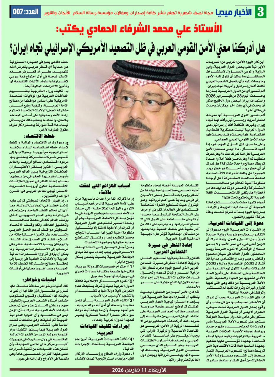 – الأستاذ على محمد الشرفاء الحمادي يكتب: هل أدركنا معنى الأمن القومي العربى فى ظل التصعيد الأمريكي الإسرائيلي تجاه إيران؟