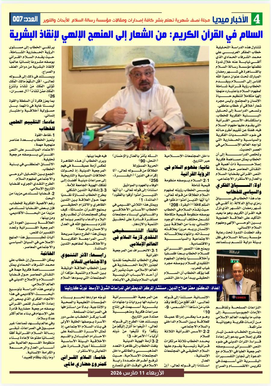 – السلام فى القرآن من الشعار إلى المنهج الآلهى لإنقاذ البشرية دراسة إعداد د. معتز صلاح الدين مستشار المركز الديمقراطي لدراسات الشرق الأوسط بنورث كارولينا.