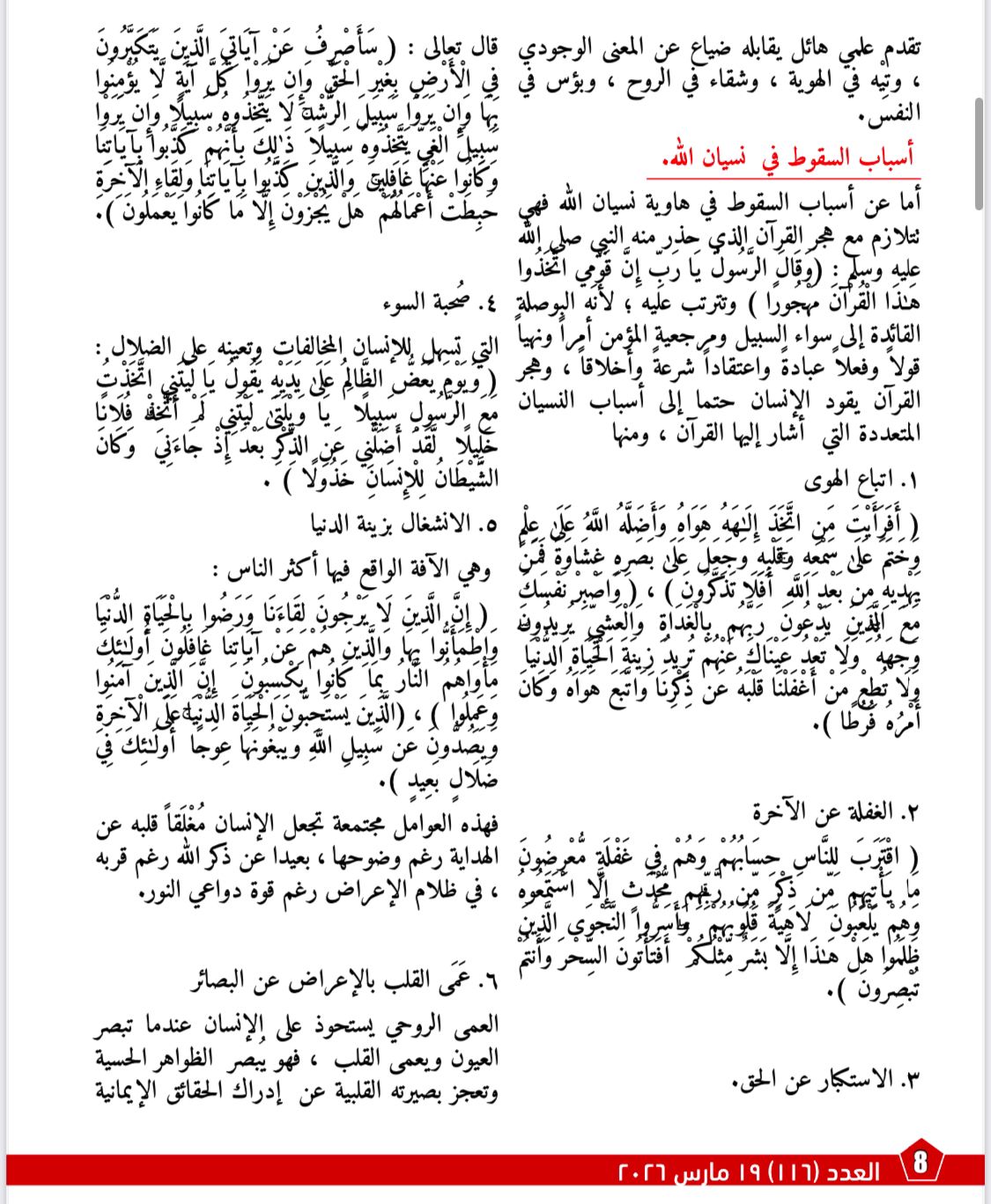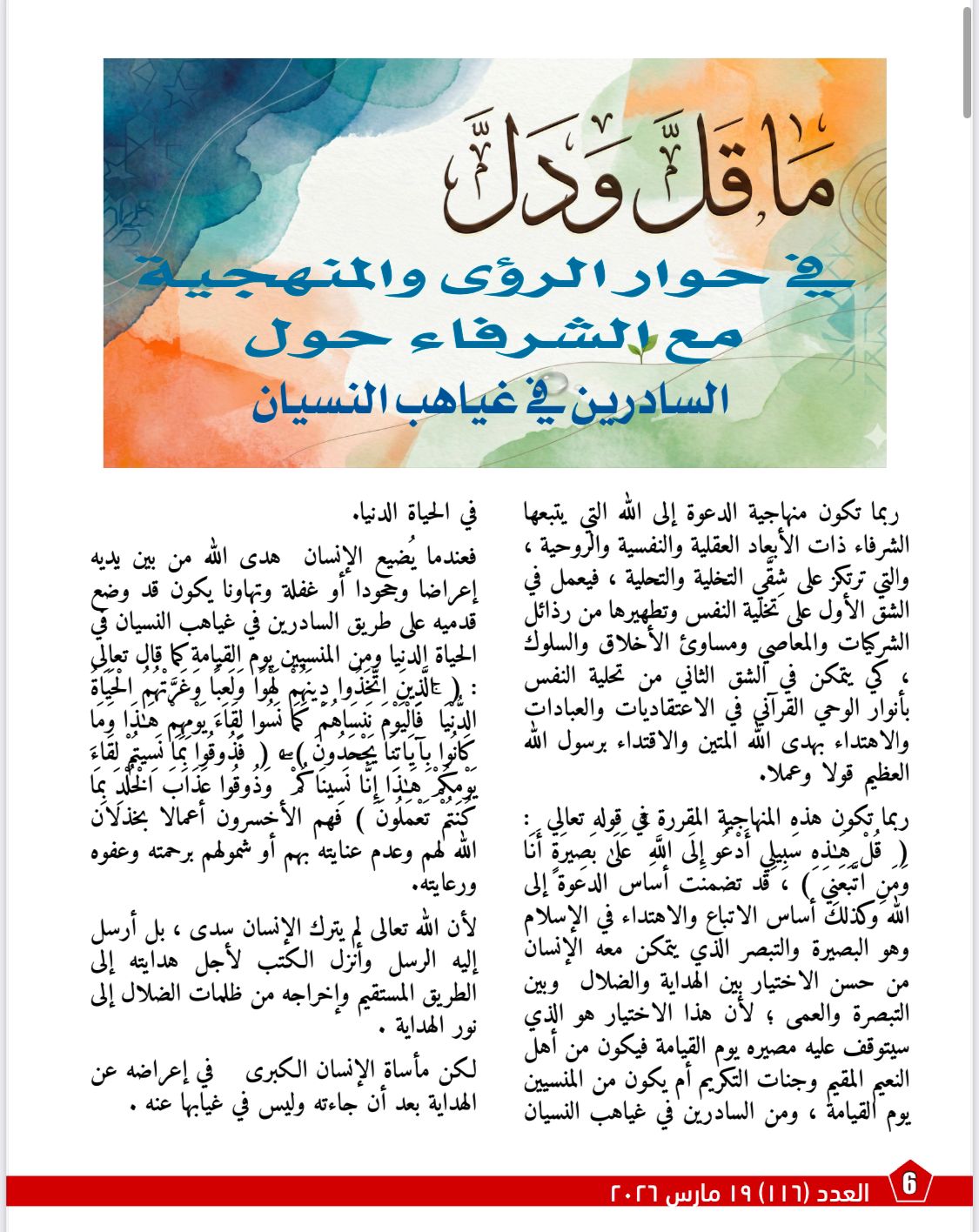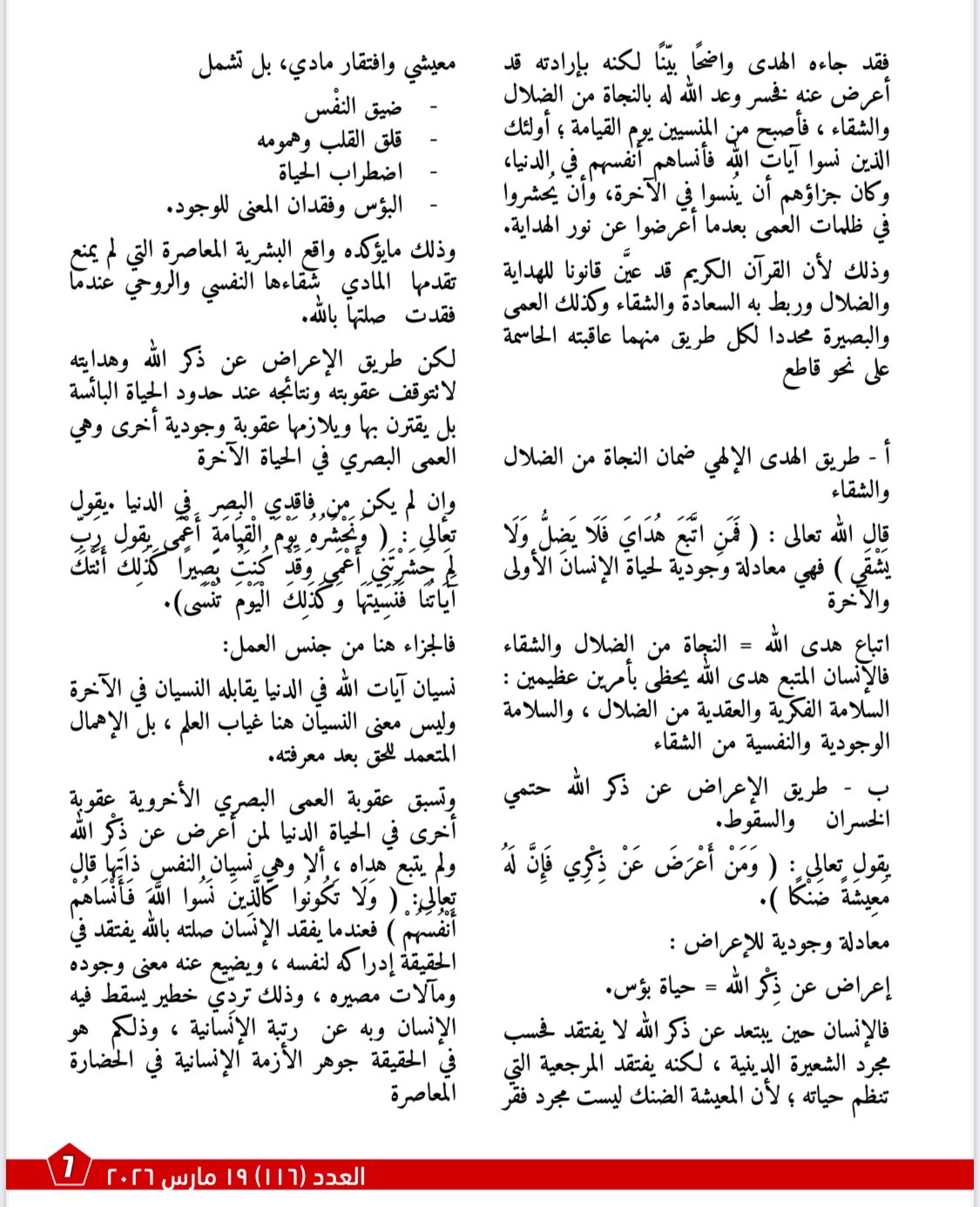 ويأتي مقال «ما قلَّ ودلَّ» في هذا العدد بوصفه امتدادًا منهجيًا وروحيًا لأطروحة الشرفاء، إذ ينقل النقاش من نقد التراث إلى بيان أثر الهداية القرآنية في بناء النفس والوعي والمصير. ويركز المقال على أن الدعوة إلى الله لا تقوم إلا على البصيرة، وأن الإنسان حين يُعرض عن هدى الله يدخل في مسار النسيان والضياع، بينما يكون اتباع الوحي طريق النجاة من الضلال والشقاء. كما يتتبع المقال أسباب السقوط في نسيان الله، من اتباع الهوى والغفلة والاستكبار وصحبة السوء والانشغال بزينة الدنيا، ليؤكد في النهاية أن البصائر القرآنية هي النور الذي يخرج الإنسان من ظلمات الغفلة إلى نور الهداية.