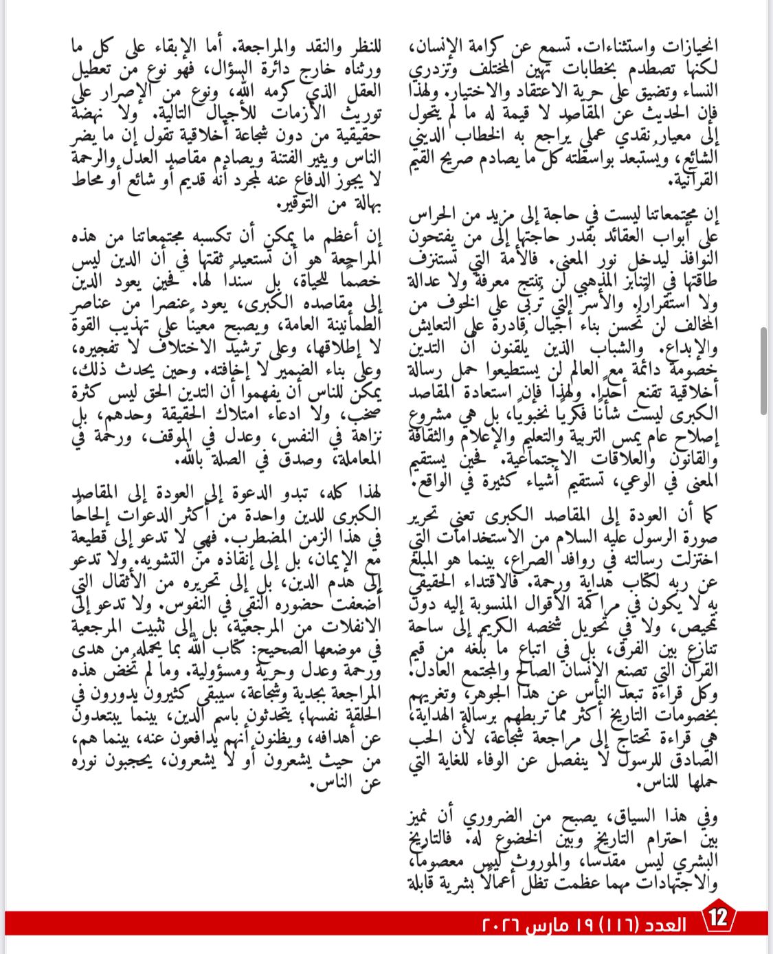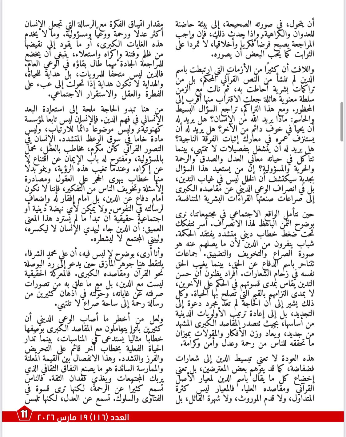 ويناقش مقال «كيف تُنقذ المقاصد الكبرى الإيمان من فوضى التراث؟» حيث يوضح كيف أدى انصراف الوعي الديني عن مقاصده الكبرى إلى تحويل الدين من رسالة هداية إلى ساحة خصومات وصراعات. ويركز على أن العودة إلى المقاصد العليا للدين تمثل ضرورة حضارية وأخلاقية، لأنها تعيد ترتيب الأولويات على أساس الرحمة والعدل والكرامة والحرية، وتخضع كل ما يقال باسم الدين لمعيار القرآن وغايته في إصلاح الإنسان والمجتمع.