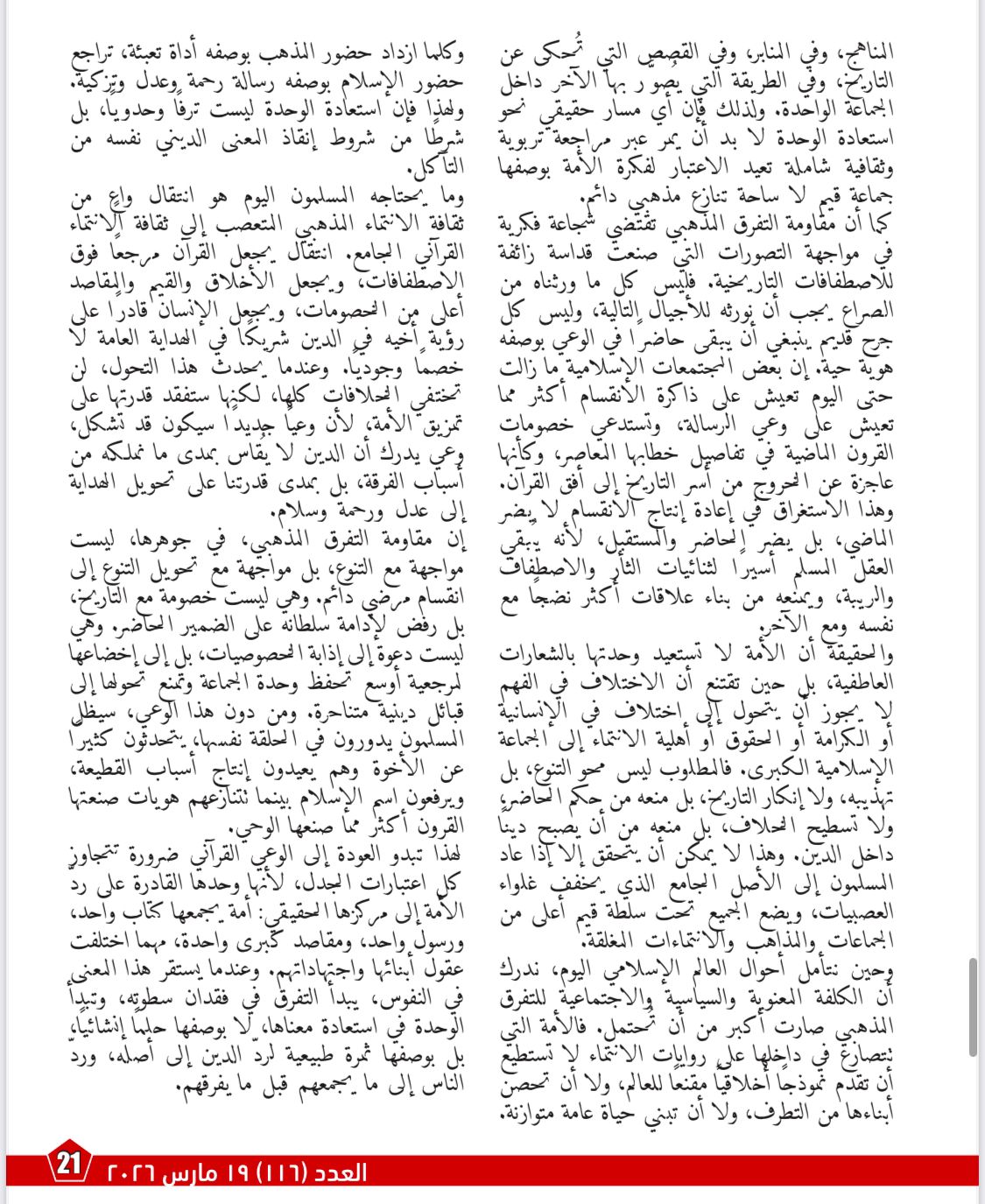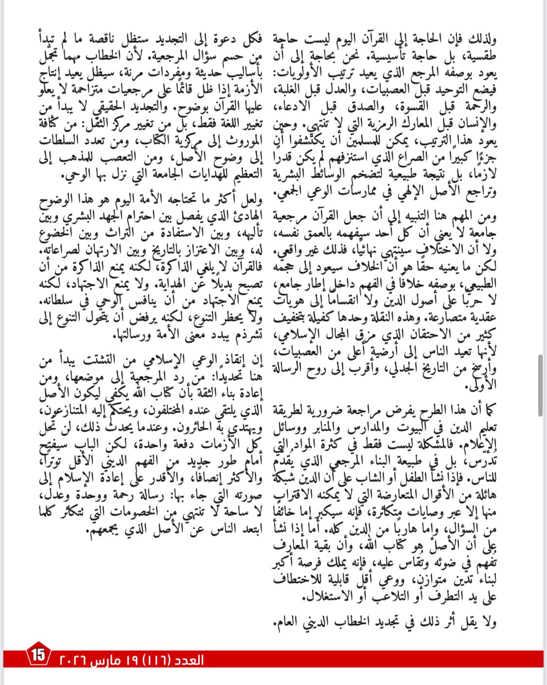 بينما يركز مقال «القرآن مرجعيةً جامعة لإنقاذ الوعي الإسلامي من التشتت» على أن أزمة المسلمين اليوم لا تكمن في قلة الخطاب الديني، بل في غياب المرجعية الجامعة التي تردّ الخلافات إلى أصل حاكم وواضح. ويؤكد أن جعل القرآن المرجعية الأولى يعيد ضبط العلاقة بين الوحي والاجتهاد، ويخفف من سطوة المرجعيات الفرعية، ويفتح الباب أمام فهم أكثر اتزانًا للإسلام بوصفه رسالة وحدة ورحمة وعدل.