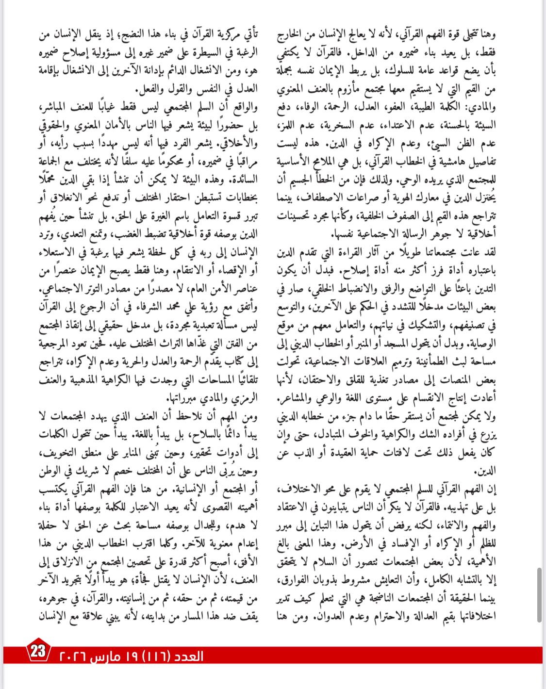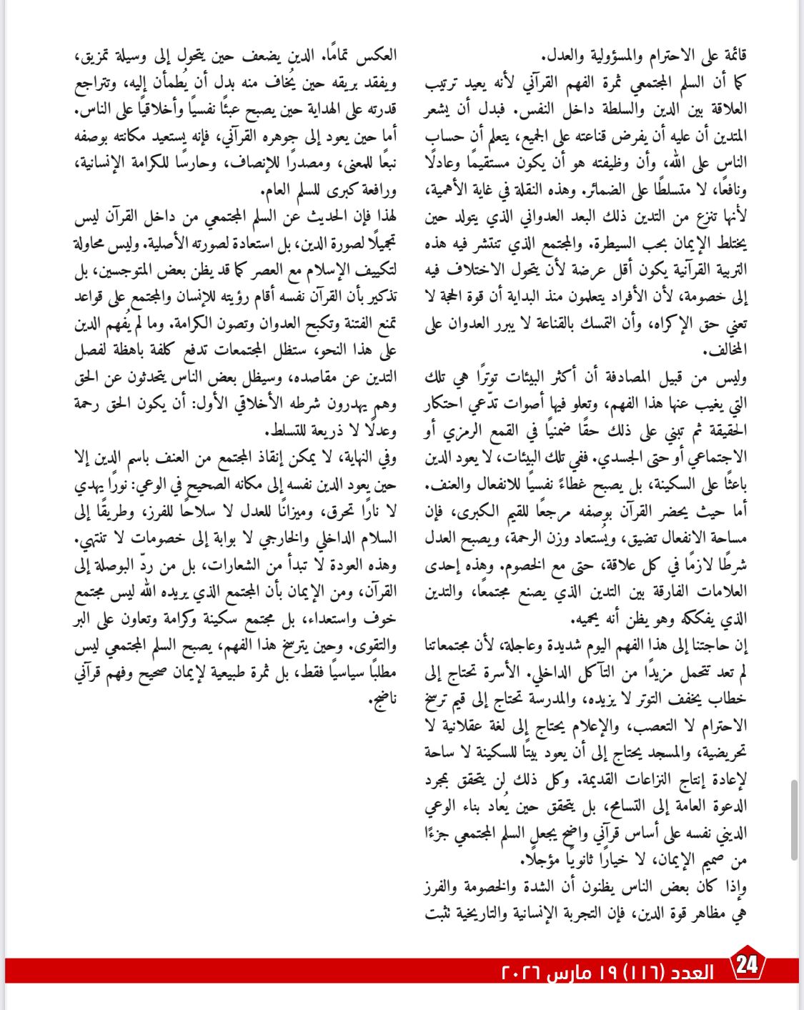 إلى أن السلم المجتمعي ليس قيمة هامشية، بل ثمرة مباشرة للفهم الصحيح للقرآن. ويشرح أن الخطاب الديني حين ينفصل عن قيم الرحمة والعدل وضبط النفس وكرامة الإنسان يتحول إلى مصدر توتر وتمزيق، بينما يضمن الوعي القرآني بناء مجتمع أكثر توازنًا وأقل قابلية للكراهية والعنف والإقصاء.