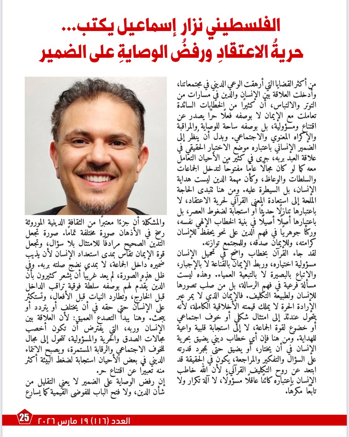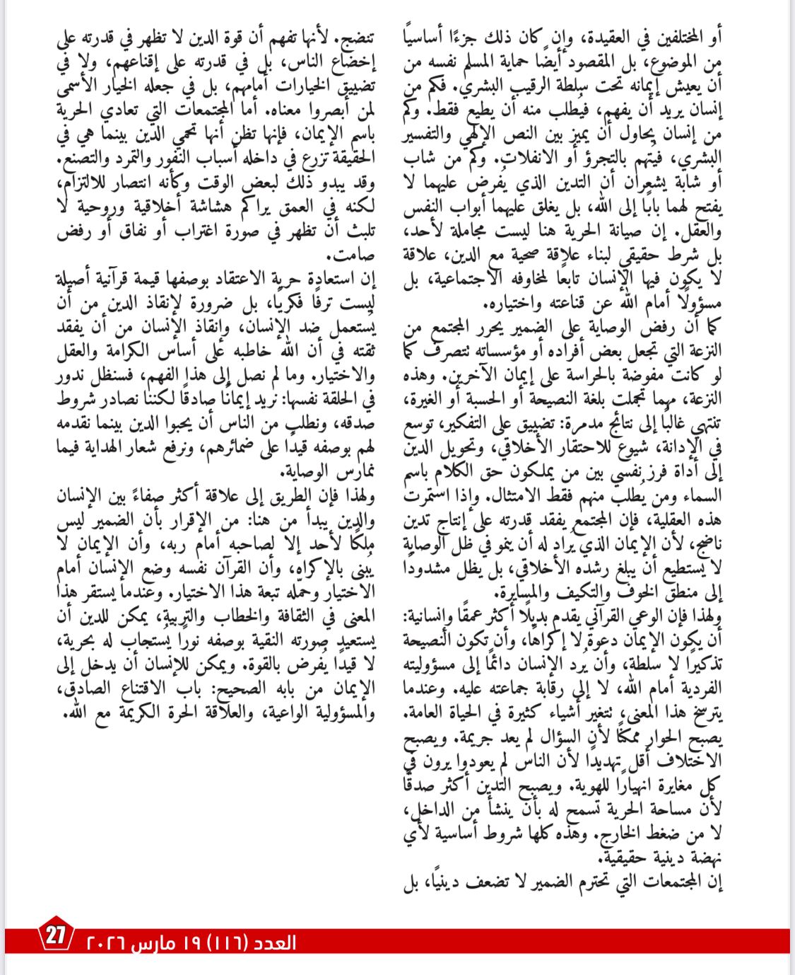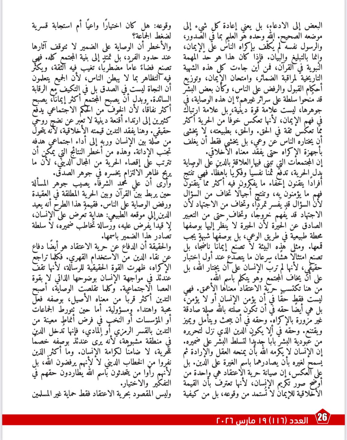 بينما يناقش مقال «حرية الاعتقاد ورفض الوصاية على الضمير»