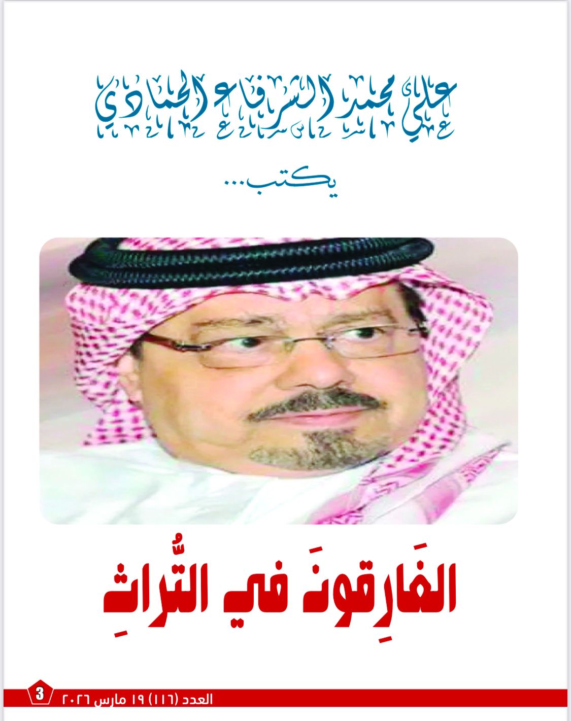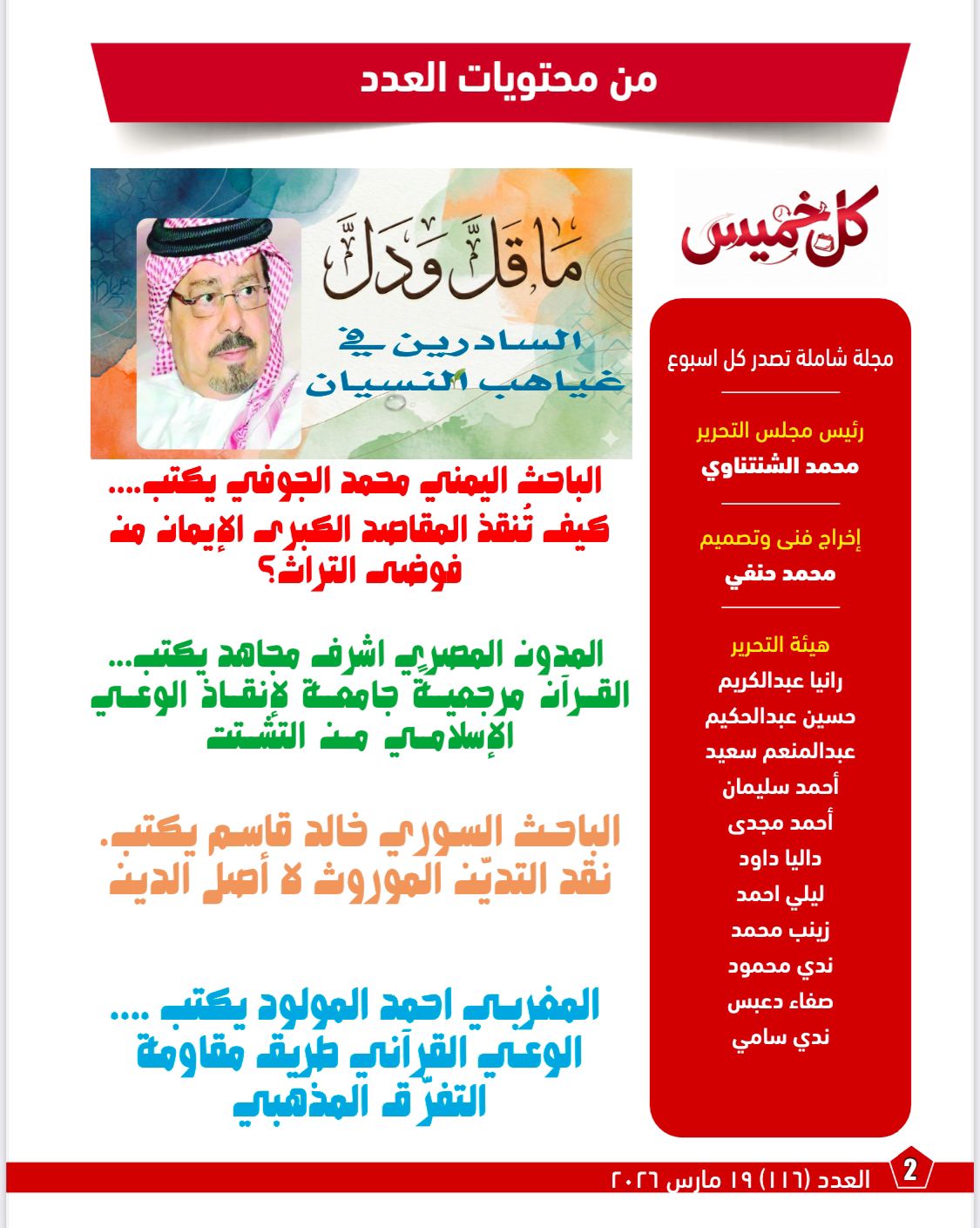 تضمن العدد مناقشة مقال المفكر العربي الاستاذ علي محمد الشرفاء الحمادي بعنوان «الغارقون في التراث»، في معالجة تحريرية تعكس توجه المجلة نحو فتح نقاش معرفي رصين حول قضايا الوعي الديني، ومرجعية القرآن الكريم، وحدود العلاقة بين النص الإلهي والموروث البشري، وأثر ذلك كله في واقع المسلمين المعاصر.